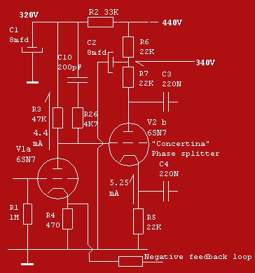 Etapa de entrada combinada con un desfasador Tipo “concertina o phasesplitter” usando válvula 6SN7.