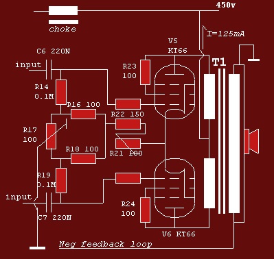 Etapa de potencia, usando en la versión original las válvulas KT66 pero que después cada fabricante sustituyó por su preferida (EL34, 6L6, 6550, etc). Esta consiste en un montaje en push pull usando la válvula tetrodo configurada como triodo y trabajando en clase A.