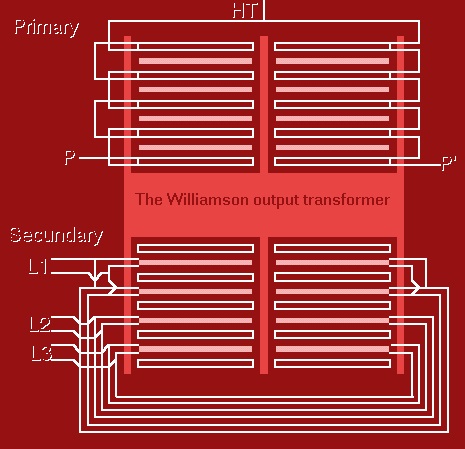 La razón principal por lo que el amplificador Williamson se hizo famoso fue por el transformador de salida. Fue una “obra maestra” nunca vista hasta entonces. Williamson lo calculó con una banda pasante plana desde los 2 Hz hasta los 60 KHz. Solo el mejor transformador posible permitía al amplificador trabajar de una manera estable con una fuerte realimentación negativa.